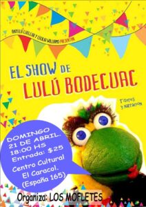 El domingo en el Centro Cultural Caracol recibirá la visita del Grupo de Teatro Acurruca de la ciudad de Viedma, presentando “Show de Lulú Bodecuac», un espectáculo de títeres y narración en el que se conjuga el humor, el juego, el disparate y la poesía”, por la titiritera Cecilia Williams y la narradora Anyela Cuellar.