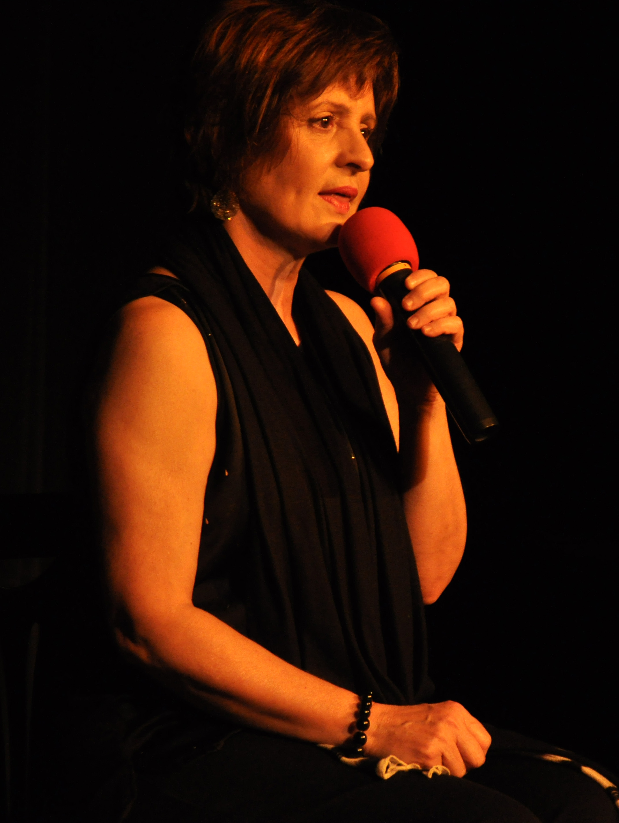 “Aquellas pequeñas cosas” de Joan Manuel Serrat le dio el paso al escenario, frente al cual la esperaba una sala llena de hombres y mujeres ávidos de remembranzas y recuerdos de épocas pasadas. Y citando a Vincent Van Gogh: “Encuentra bello todo lo que puedas”, Ana María comenzó la primera parte de la noche con sus fotos- relatos. A partir de fotografías, ellas reconstruye historias, con hechos verdaderos y otros ficticios, y así sus relatos verosímiles van recorriendo no sólo su infancia, sino la de los espectadores; las noches en la cama de la abuela, rituales, volviendo a pasar por esas horas quietas de la noche, trayendo al presente la voz amada.
