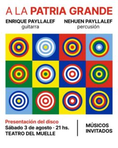 El sábado 3 a las 21 horas, Enrique Payllalef presentará su nuevo disco A la Patria Grande. Esta nueva grabación incluye obras propias en guitarra y temas del cancionero folclorico nacional y latinoamericano acompañado por Nehuén Payllalef en percusión, Pato Gonzáles en bajo y la cantante Emi Robles.